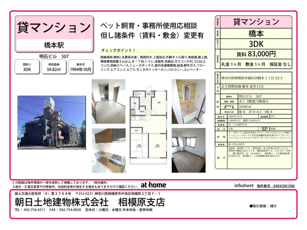 | 主要アクセス | 京王相模原線 橋本駅 から 徒歩12分 | 専有面積 | 59.82m 2 ( 18.09坪 ) | ||
